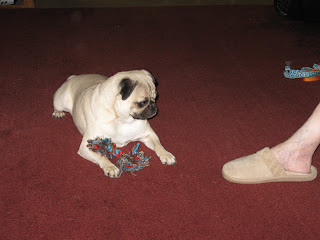 Saturday and Sunday and even on Monday, we just slept in and hung out and had lots fun. I mostly played with my rope toy until this evil slipper tried to steal it.