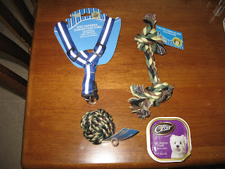 I also got some other cool stuff. I got a rope bone (my favorite!), I got a rope ball, a reflective harness, and a special birthday dinner!